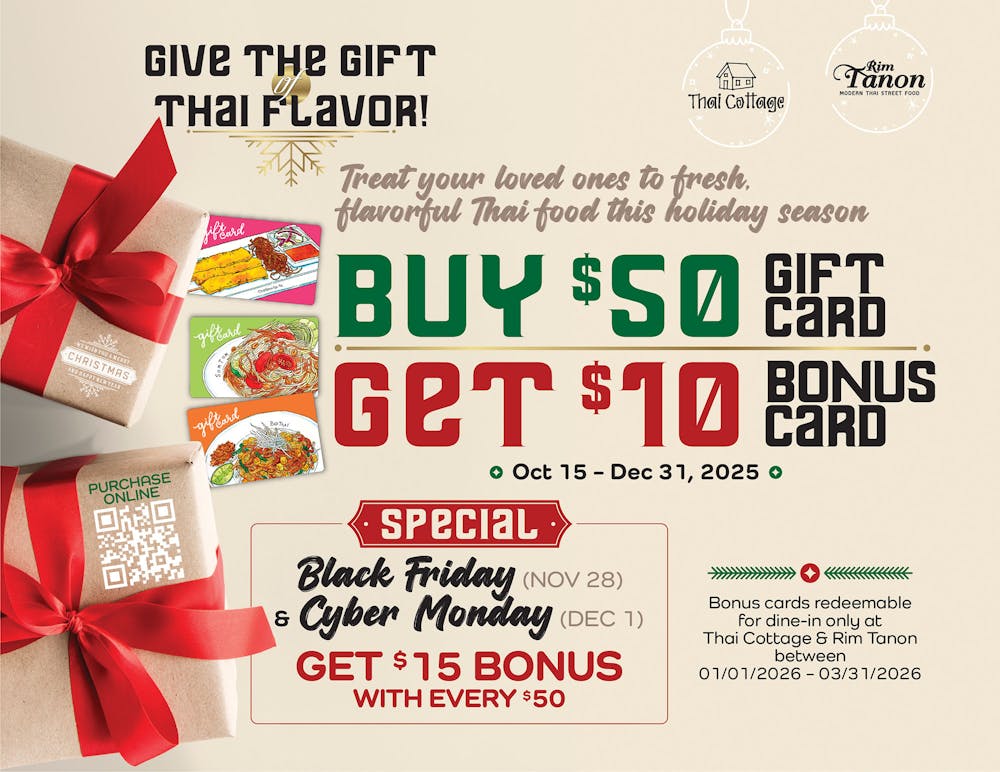 Redeemable at all Thai Cottage and Rim Tanon locations for dine-in, takeout, or catering services.