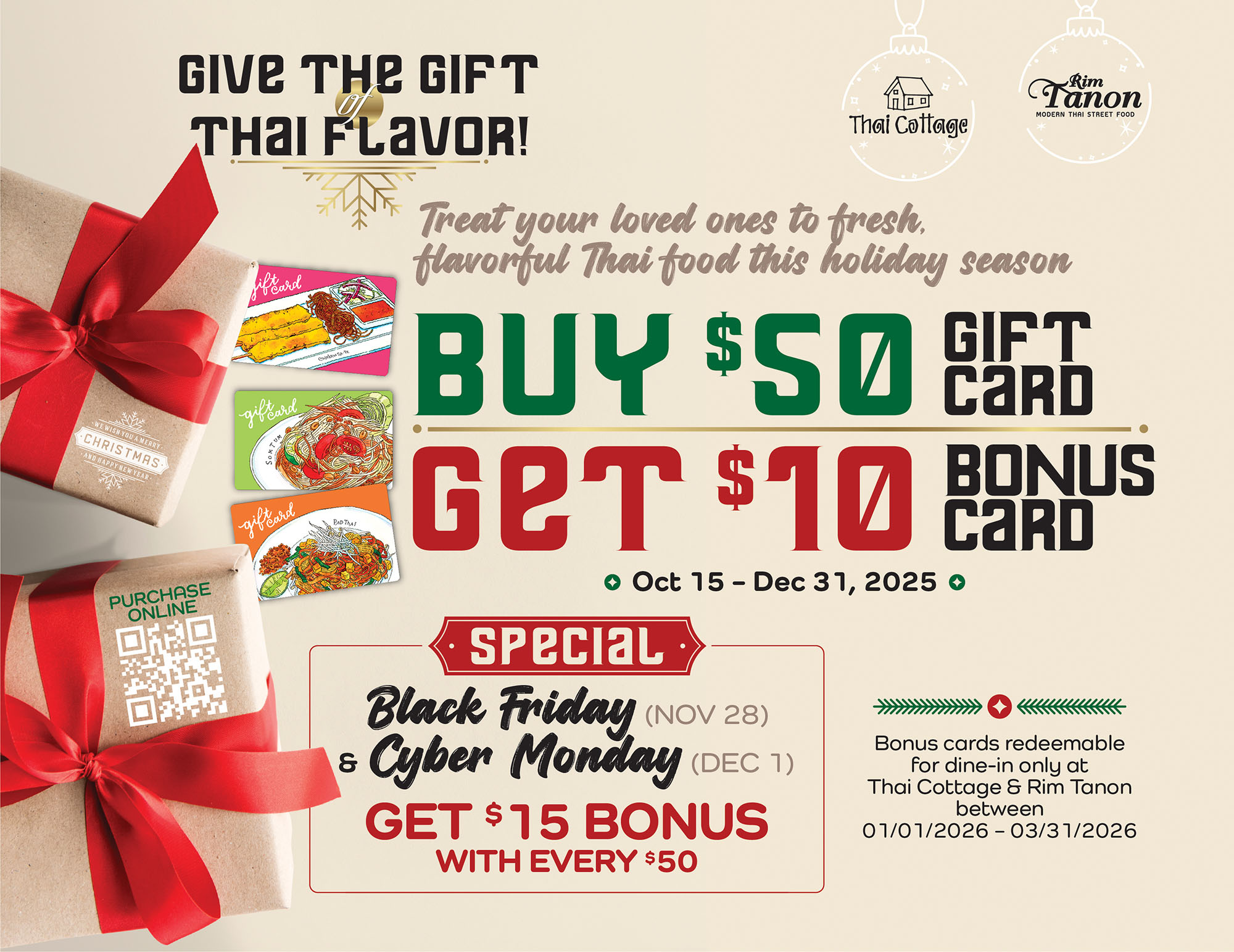 Redeemable at all Thai Cottage and Rim Tanon locations for dine-in, takeout, or catering services.